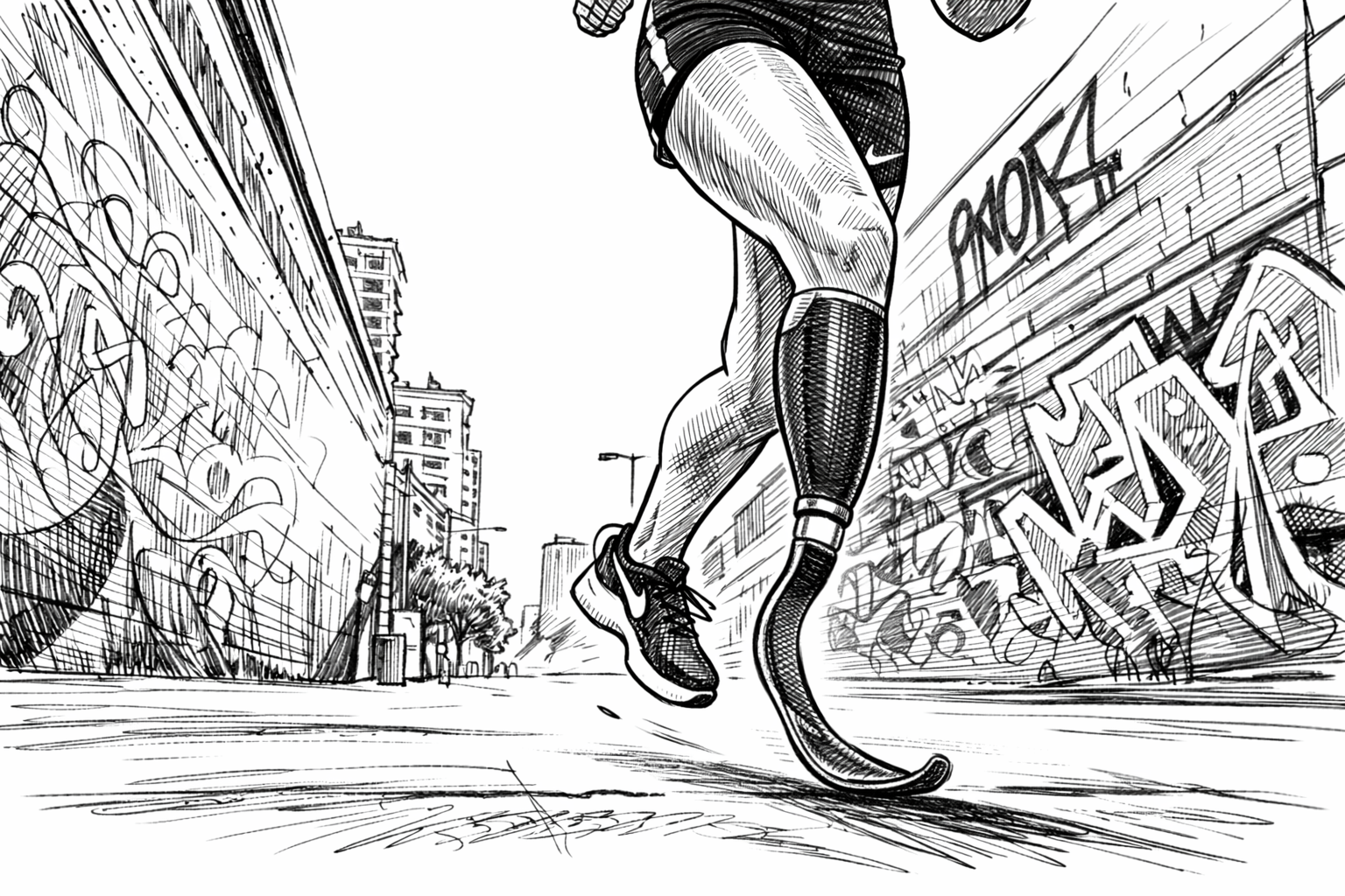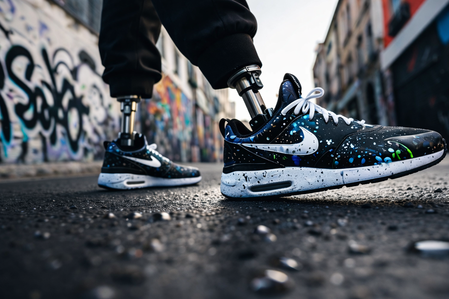 The project started with a design intention centered on equality and freedom. I wanted to express a world where people with physical disabilities and people without disabilities are seen with the same dignity, without distinction or limitation. The visual direction focused on a sense of urban freedom, movement, and confidence that goes beyond physical constraints. The shoe silhouette itself remained relatively basic and wearable, while the graphic details on the shoe were designed to feel more expressive, city-driven, and spontaneous, inspired by a painterly marker-like energy. This step was important because it defined not only the visual tone, but also the emotional message behind the concept.