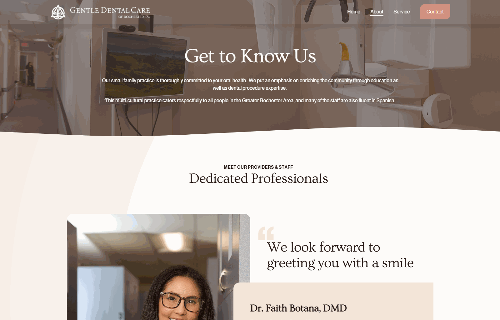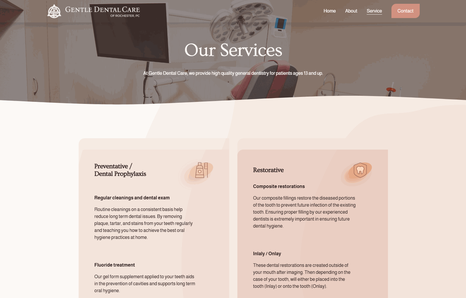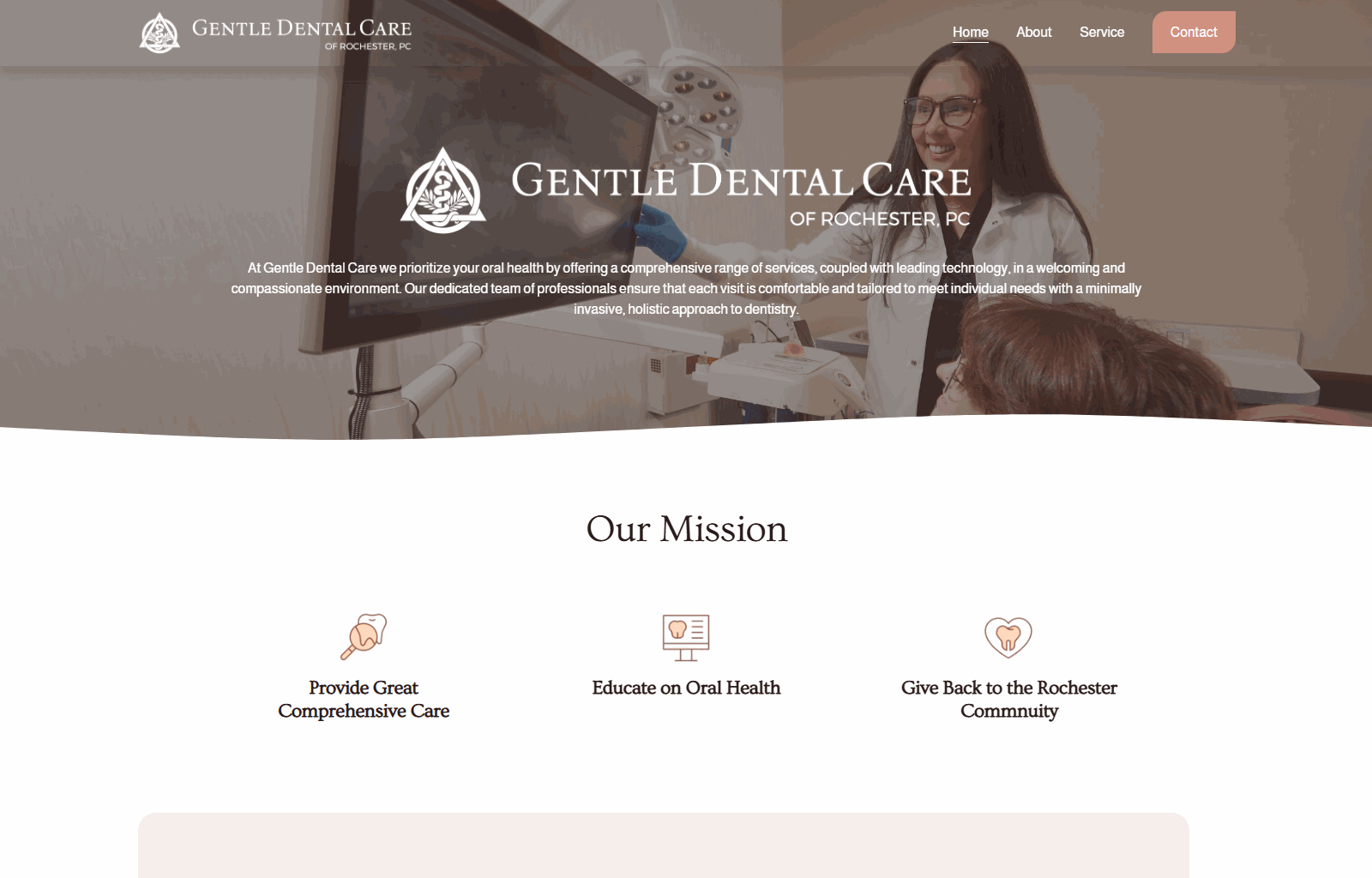 The website redesign for Rochester Gentle Dental was completed and launched in Feb, 2025. I used a website builder as the foundation and customized it with HTML, CSS, and JavaScript to create a tailored theme that better reflects the brand and improves the user experience.