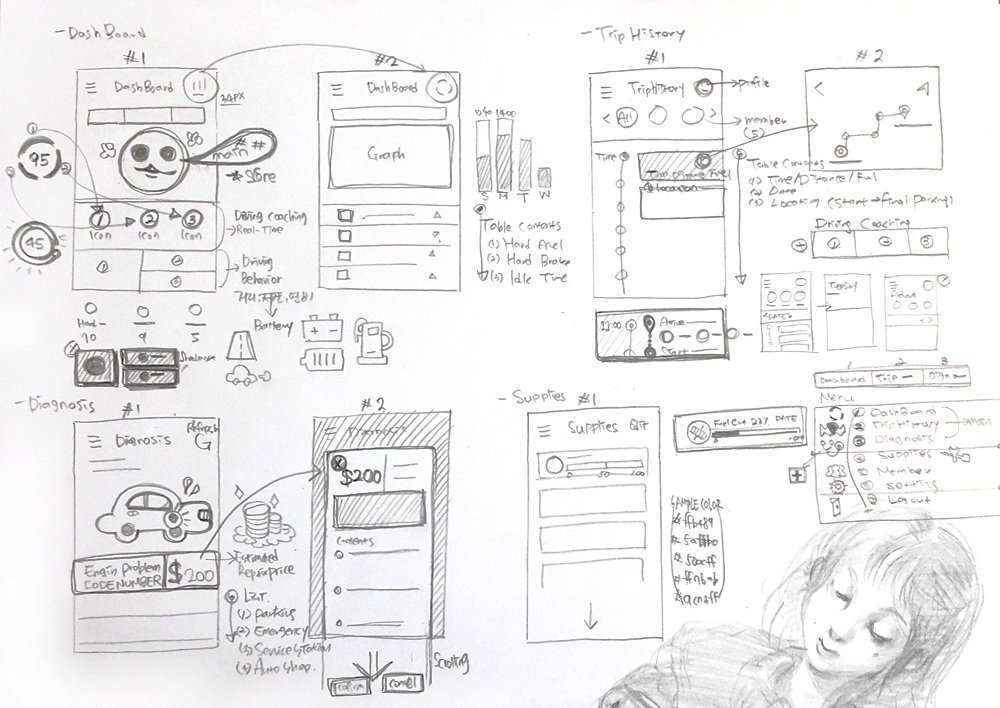 After creating the user flow, I made a rough sketch of how I would design the app. I thought about the interface composition, including the main dashboard, trip history, scanning page, and repair shop recommendations, and designed a wireframe.